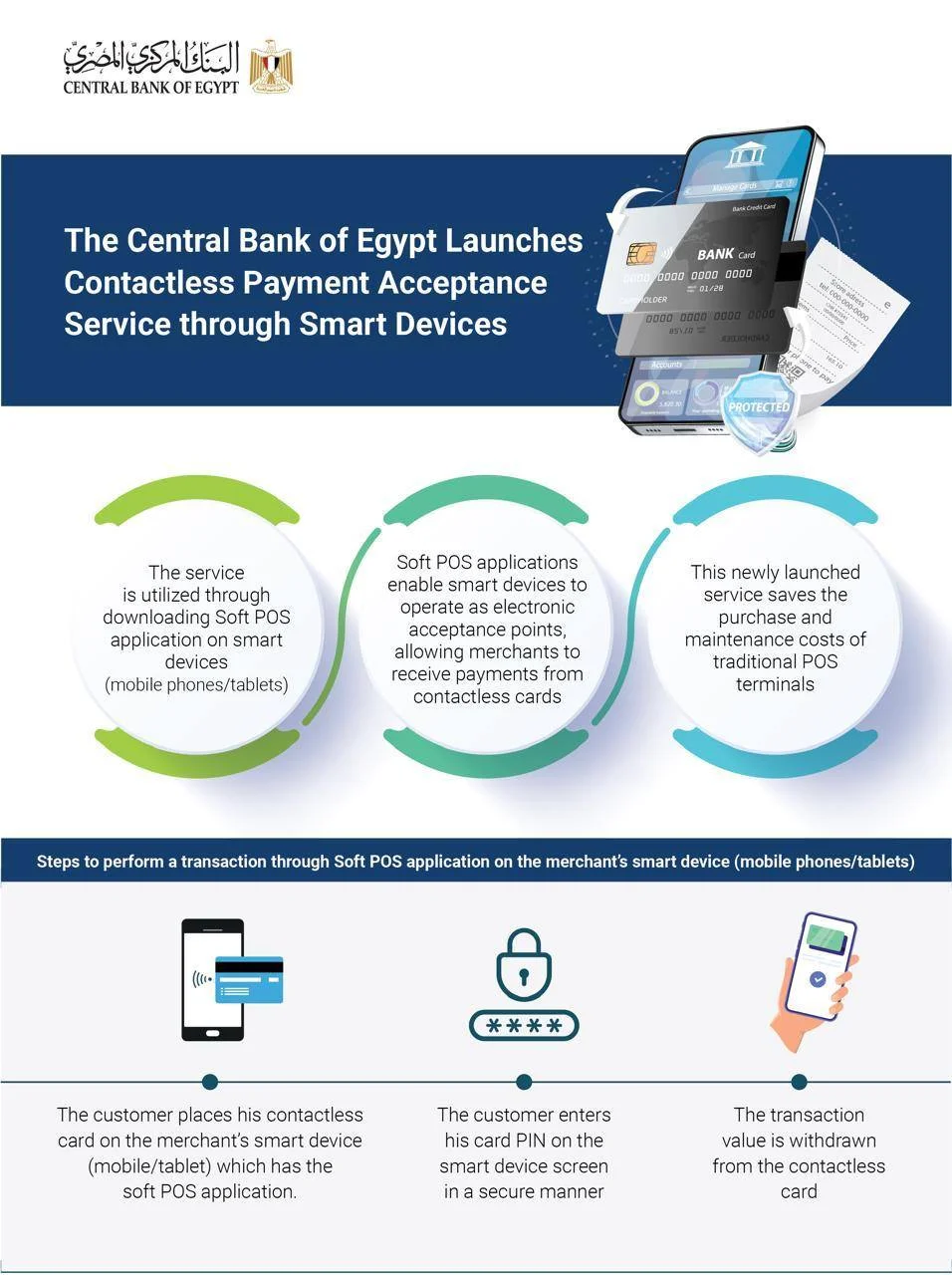 أعلن البنك المركزي المصري عن إطلاق خدمة قبول المدفوعات الإلكترونية اللاتلامسية عبر الأجهزة الذكية (الموبايل / التابلت) باستخدام تطبيقات Soft POS، وذلك في إطار إستراتيجية التحول نحو مجتمع أقل اعتمادًا على النقد وتعزيز الشمول المالي، وتحقيق رؤية مصر 2030.