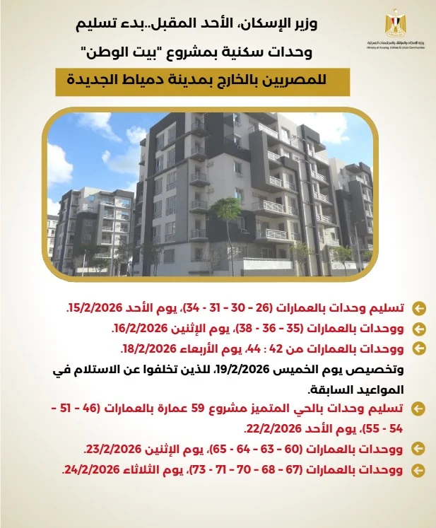 بيت الوطن" للمصريين بالخارج بمدينة دمياط الجديدة" data-test-id="message-group-subject" aria-label="بالإنفوجراف: وزير الإسكان، الأحد المقبل..بدء تسليم وحدات سكنية بمشروع "بيت الوطن" للمصريين بالخارج بمدينة دمياط الجديدة, File attached">نشرت وزارة الإسكان والمرافق والمجتمعات العمرانية ، انفوجراف عن بدء تسليم وحدات سكنية بمشروع بيت الوطن المخصص للمصريين بالخارج بمدينة دمياط الجديدة ، وذلك بدءاً من الأحد المقبل ، وحتى يوم الخميس 5/3/2026، وفقاً للمواعيد المقررة للتسليم.
