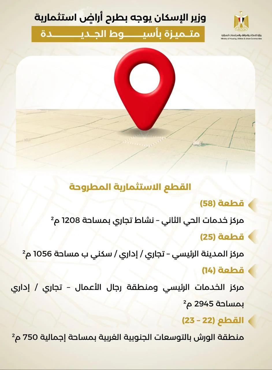 طرح أراض استثمارية جديدة بمواقع متميزة بأسيوط الجديدة (إنفوجراف)