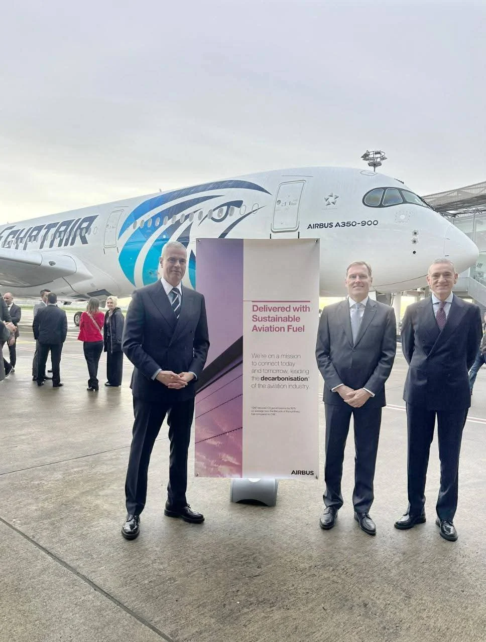 وعلى هامش استلام الطائرة في فرنسا، أُقيمت احتفالية خاصة بمصنع شركة إيرباص بمدينة تولوز الفرنسية، بحضور الطيار أحمد عادل رئيس مجلس إدارة الشركة القابضة لمصر للطيران، وMr. Wouter Van Wersch نائب الرئيس التنفيذي لشركة Airbus International، إلى جانب عدداً من مسؤولي شركة إيرباص وشركاء النجاح من باناسونيك ورولز رويس، وذلك احتفاءً بانضمام أول طائرة من طراز A350-900 إلى أسطول مصر للطيران.