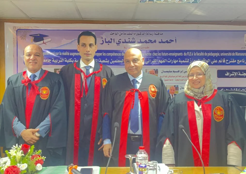 ناقشت كلية التربية بجامعة المنصورة ، رسالة الدكتوراة المقدمة من الباحث والإعلامي بقناة الحدث اليوم، مقدم برنامج “ساحة رأي”، الدكتور أحمد محمد شندي، وذلك في تخصص المناهج وطرق تدريس اللغة الفرنسية، بعنوان:برنامج مقترح قائم على الواقع المعزز لتنمية مهارات الفهم الكتابي لدى الطلاب المعلمين بشعبة اللغة الفرنسية بكلية التربية – جامعة المنصورة” .