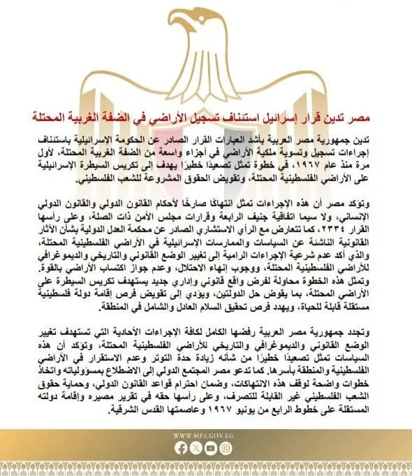 وتجدد جمهورية مصر العربية رفضها الكامل لكافة الإجراءات الأحادية التي تستهدف تغيير الوضع القانوني والديموغرافي والتاريخي للأراضي الفلسطينية المحتلة، وتؤكد أن هذه السياسات تمثل تصعيدًا خطيرًا من شأنه زيادة حدة التوتر وعدم الاستقرار في الأراضي الفلسطينية والمنطقة بأسرها. كما تدعو مصر المجتمع الدولي إلى الاضطلاع بمسؤولياته واتخاذ خطوات واضحة لوقف هذه الانتهاكات، وضمان احترام قواعد القانون الدولي، وحماية حقوق الشعب الفلسطيني غير القابلة للتصرف، وعلى رأسها حقه في تقرير مصيره وإقامة دولته المستقلة على خطوط الرابع من يونيو ١٩٦٧ وعاصمتها القدس الشرقية.