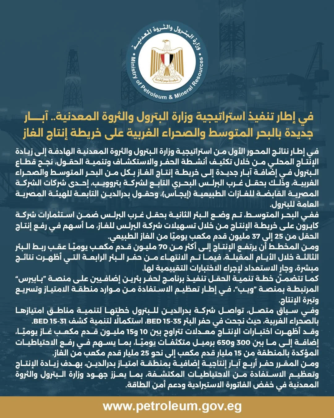 وفي سياق متصل، تواصل شركة بدرالدين للبترول خطتها لتنمية مناطق امتيازها بالصحراء الغربية، حيث نجحت في حفر البئر BED 15-35، استكمالًا لتنمية كشف BED 15-31.