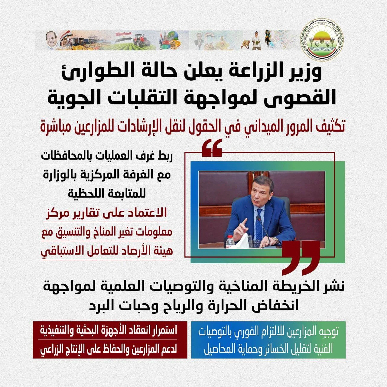وتأتي هذه الإجراءات استناداً إلى التقارير والتوصيات الفنية الصادرة عن مركز معلومات تغير المناخ بمركز البحوث الزراعية، وبالتنسيق مع الهيئة العامة للأرصاد الجوية، لضمان التعامل الاستباقي مع التغيرات المناخية الاستثنائية.