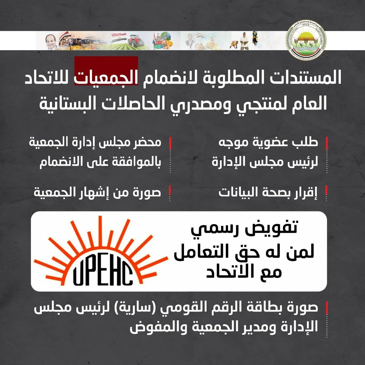 أعلنت وزارة الزراعة واستصلاح الأراضي، ممثلة في الاتحاد العام لمنتجي ومصدري الحاصلات البستانية، عن بدء تلقي طلبات العضوية الجديدة والمنضمة للاتحاد، وذلك للفئات الثلاث: الأفراد، الجمعيات الزراعية، والشركات، وذلك في إطار خطة الدولة لتطوير القطاع الزراعي البستاني، وتوجيهات علاء فاروق وزير الزراعة واستصلاح الأراضي، بتعزيز القدرات التصديرية للمنتج المصري.