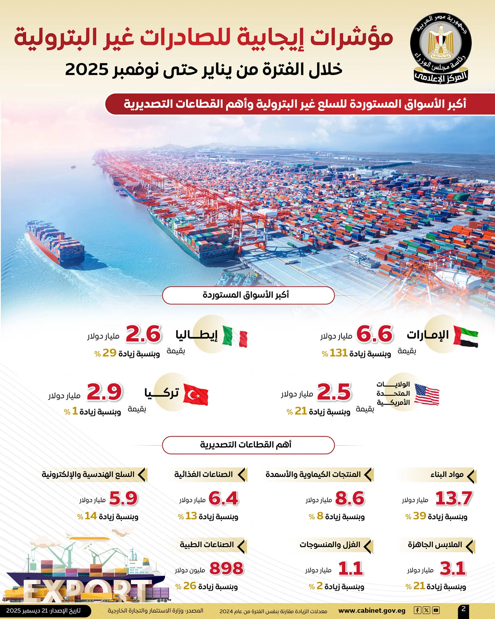 بالإنفوجراف..مجلس الوزراء:مؤشرات إيجابية للصادرات غير البترولية خلال الفترة من يناير حتى نوفمبر 2025
