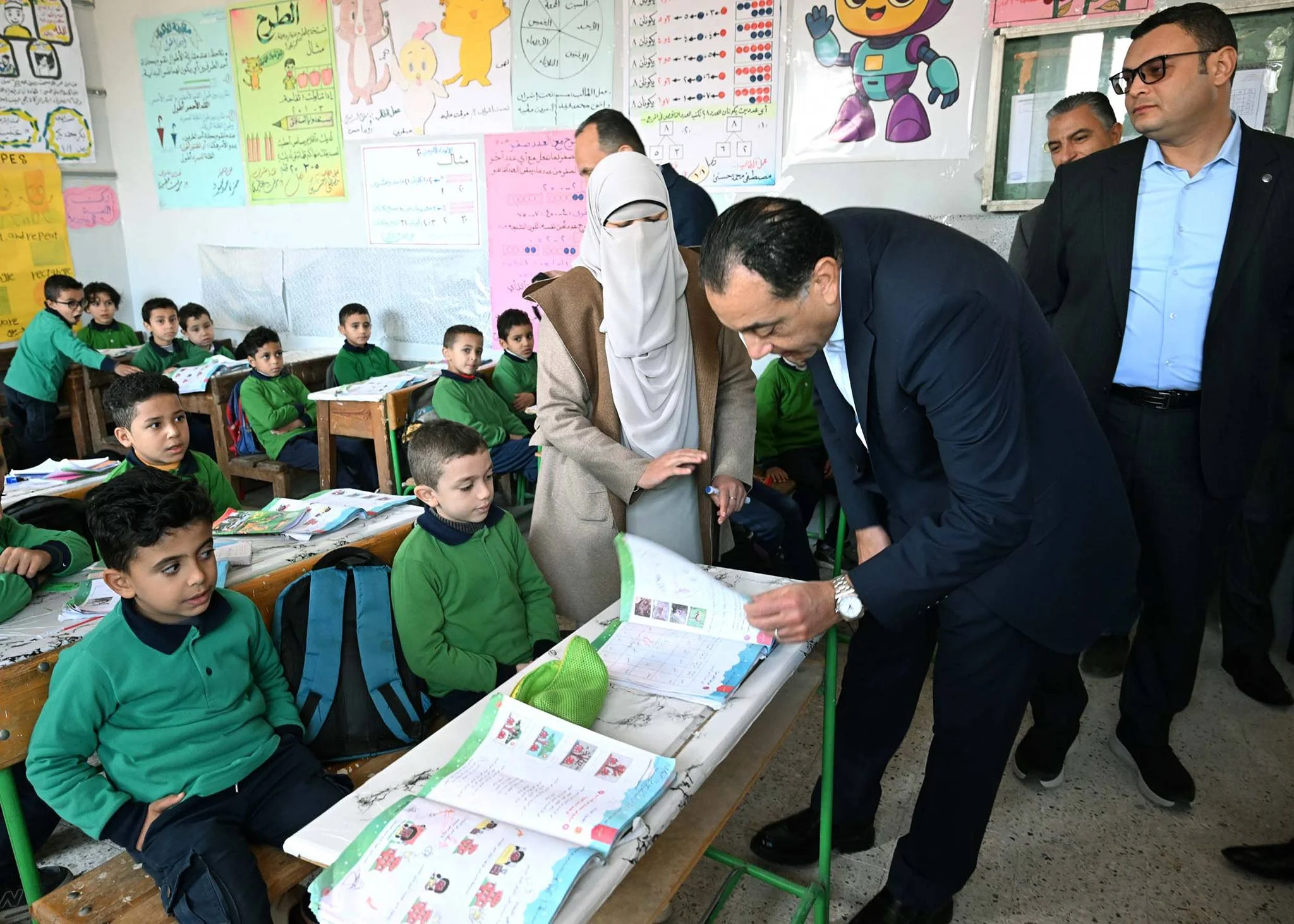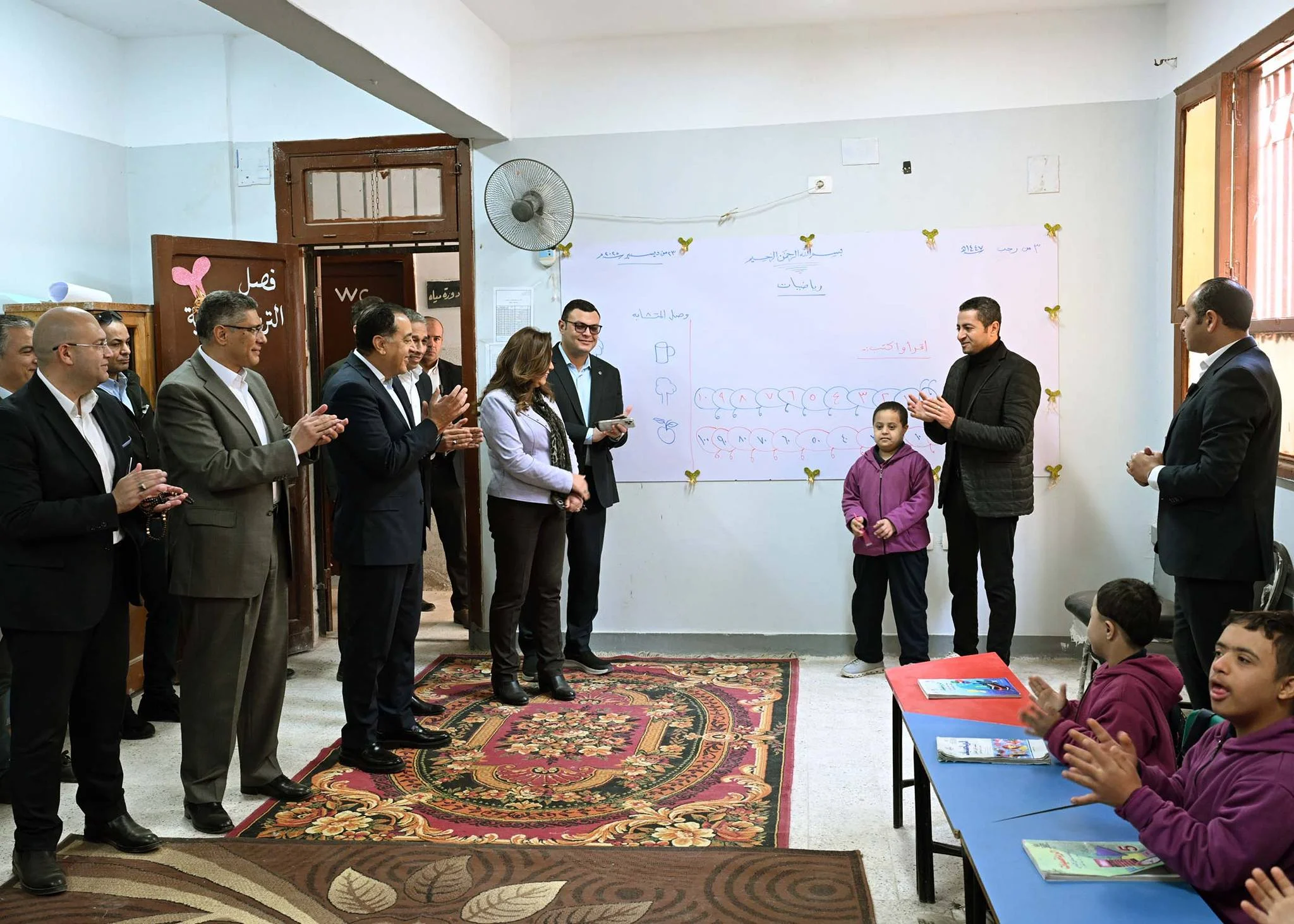 وتفقد رئيس الوزراء فصل ذوي الهمم، مستمعًا إلى شرح قدمه أحد الطلاب لزملائه عن بعض العمليات الحسابية، مشيدًا به وبزملائه متمنيًا لهم التوفيق والنجاح والتفوق.
