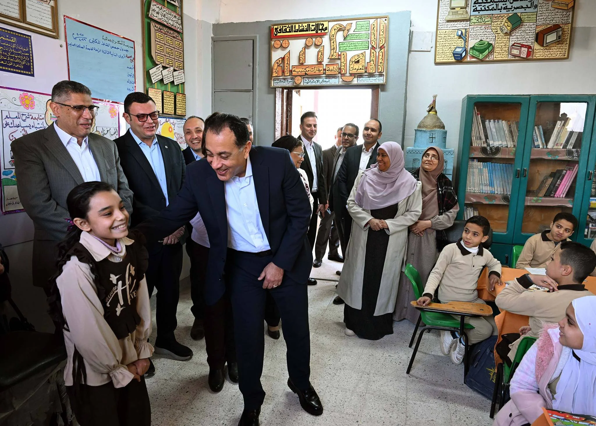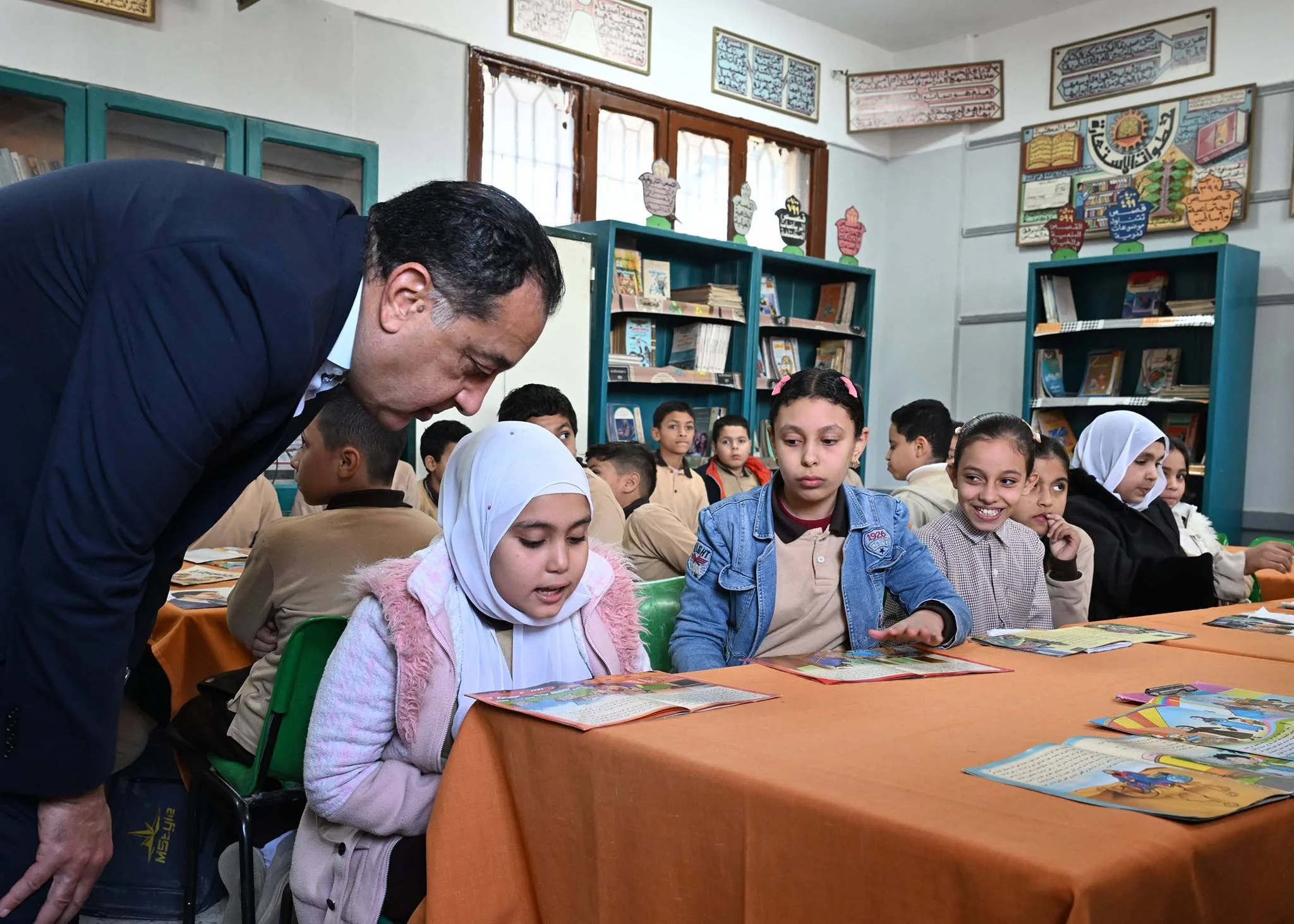 وعقب ذلك، زار الدكتور مصطفى مدبولي مكتبة المدرسة، حيث وقفت إحدى الطالبات لقراءة نص من أحد الكتب الدينية، وأشاد بمستواها، كما توقف أمام لوحة معلقة على حائط المدرسة توضح بعض النصائح والإرشادات للطلاب.