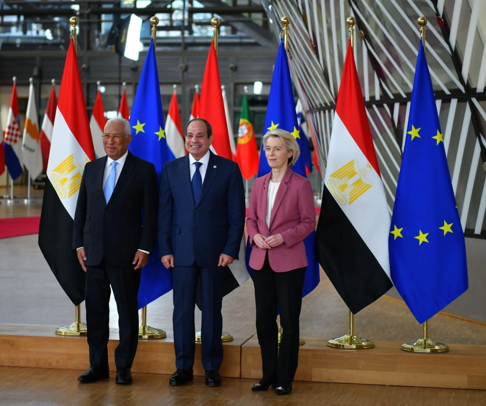 وصرح المتحدث الرسمي باسم رئاسة الجمهورية بأن كلا من رئيس المجلس الأوروبي ورئيسة المفوضية الأوروبية كانا في استقبال الرئيس السيسي ، عند وصوله  إلى مقر المجلس الأوروبي، حيث التُقطت صور تذكارية بهذه المناسبة، أعقبها لقاء ثنائي بين السيد الرئيس والمسؤولين الأوروبيين، بحضور وزير الخارجية المصري، تلاه توقيع عدد من الاتفاقيات المشتركة.