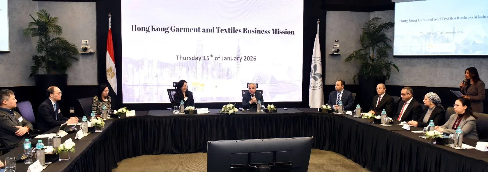 عقد المهندس محمد الجوسقي، الرئيس التنفيذي للهيئة العامة للاستثمار والمناطق الحرة، اجتماع مائدة مستديرة مع وفد رفيع المستوى من الشركات العاملة في مجال الملابس الجاهزة والمنسوجات من هونج كونج.