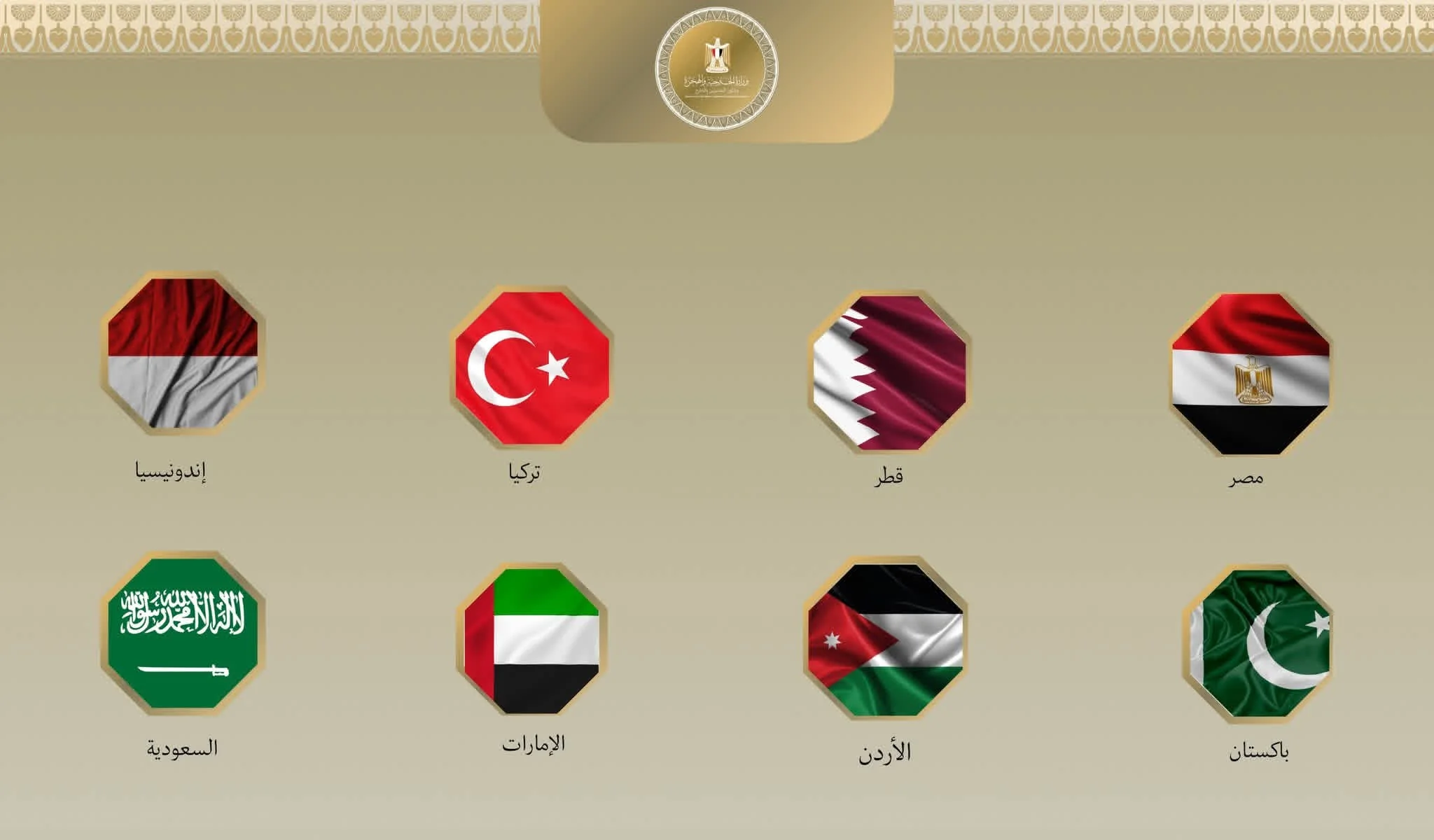 رحب وزراء خارجية كل من جمهورية مصر العربية، المملكة الأردنية الهاشمية، الإمارات العربية المتحدة، جمهورية إندونيسيا، جمهورية باكستان الإسلامية، جمهورية…